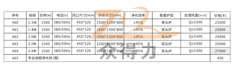 本系列油煙凈化一體機有1.5米、1.8米、2.0米、2.2米和2.4米五種規(guī)格,價格詳情請看下圖參數(shù):