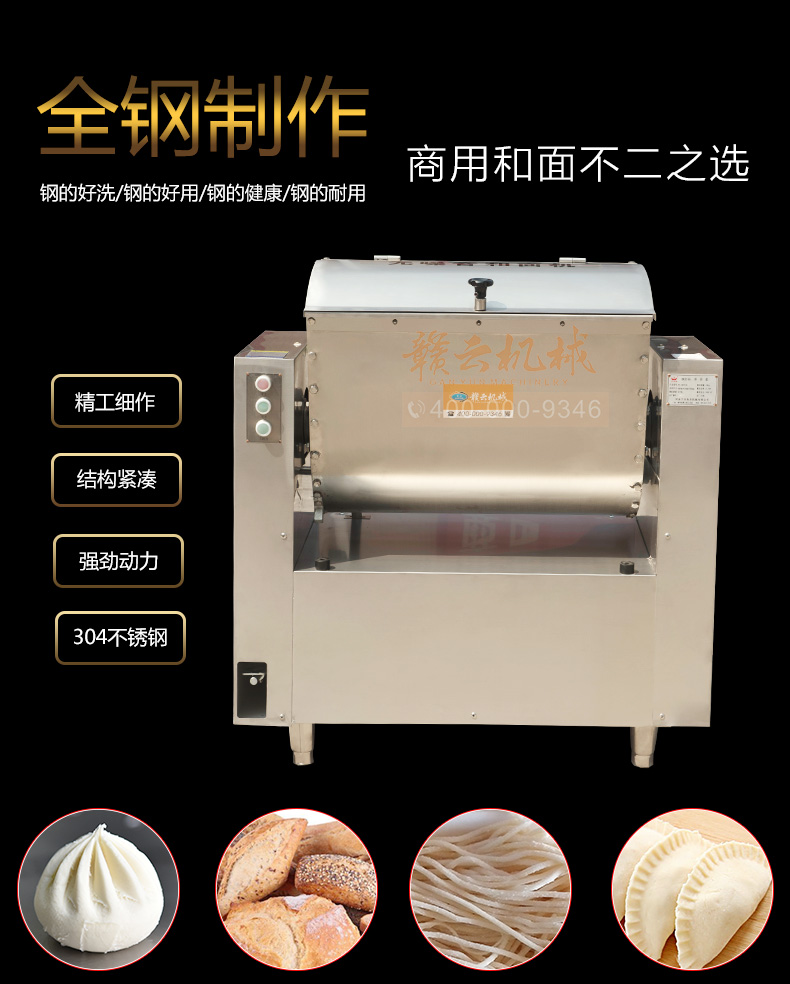 全鋼和面機(jī),工程系列50kg和面郎,整機(jī)外殼不銹鋼材質(zhì),絞龍和和面桶均為食品級(jí)不銹鋼,安全衛(wèi)生,適合中央廚房面點(diǎn)加工,面食加工廠生產(chǎn)和面攪拌之用。本系列產(chǎn)品有25kg和50kg兩種款式
