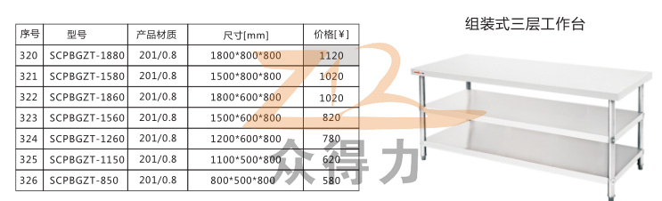 不銹鋼三層工作臺 操作臺 食堂后廚操作臺 眾得力超厚扎實耐用操作臺組裝式工作臺