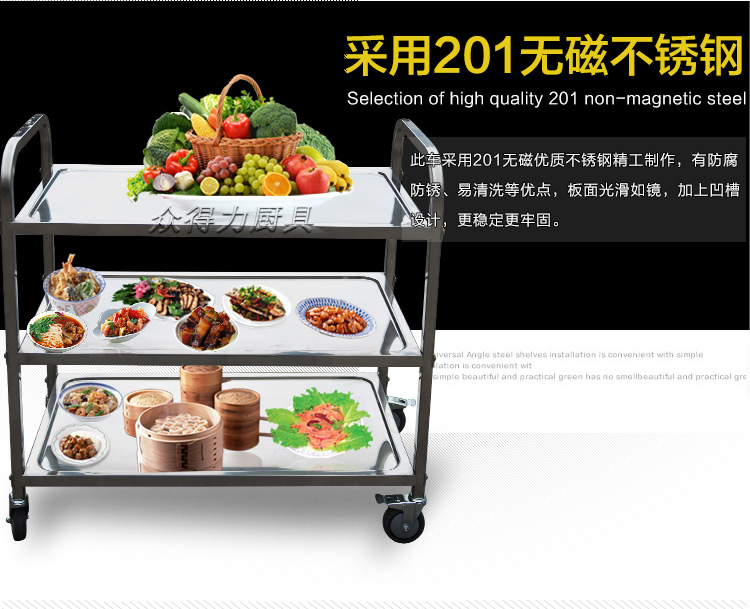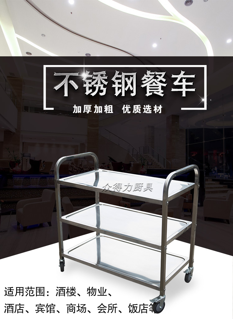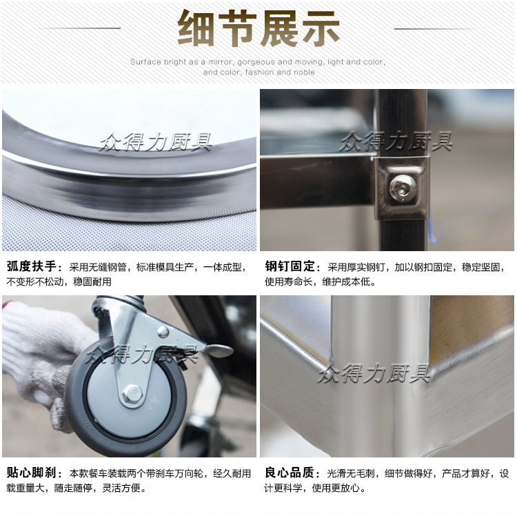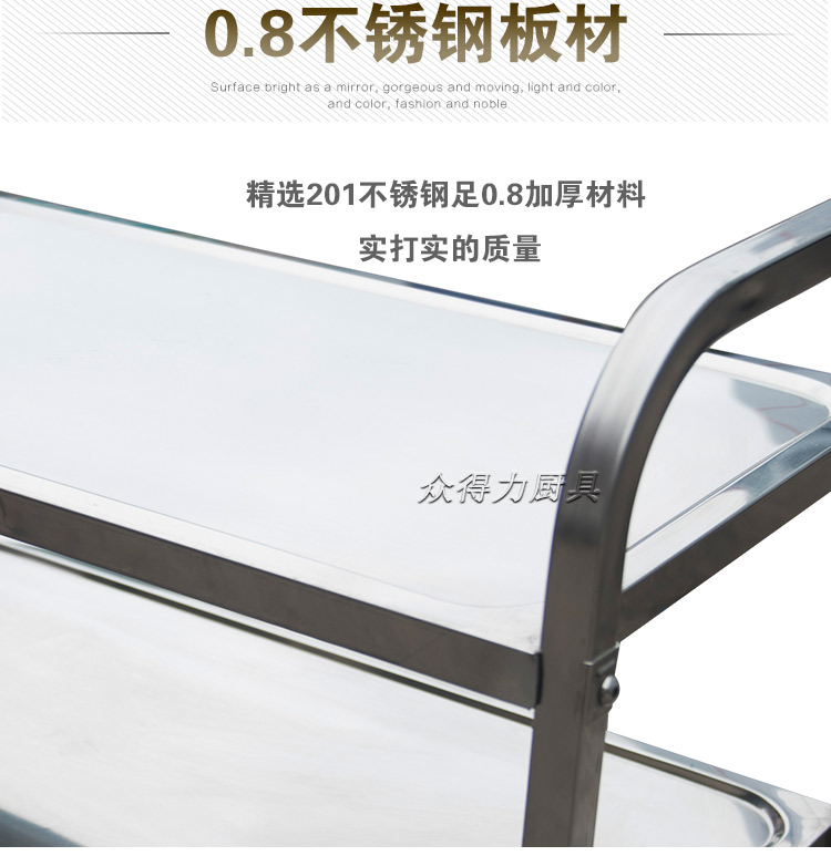 江西眾得力廚具有限公司生產(chǎn)銷售商用廚具,食品機械,提供中央廚房工程項目整體解決方案。不銹鋼餐車有大號、中號、小號,本公司生產(chǎn)銷售的不銹鋼餐車系列均采用201無磁不銹鋼材質(zhì),板材厚度足0.8mm,整機拆裝方便,結(jié)構(gòu)牢固,承重能力強。